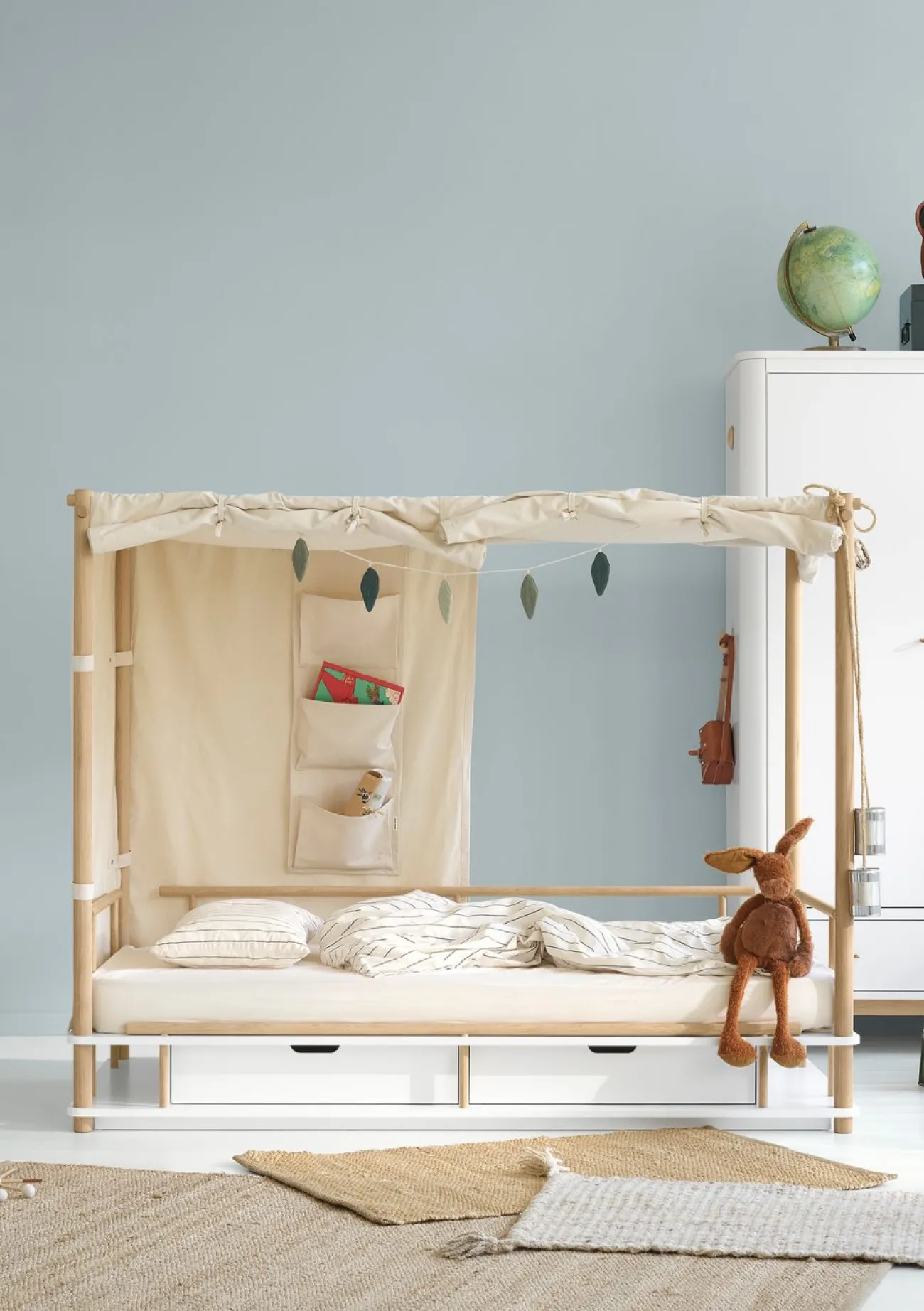 Wie in einem Zelt in der nordischen Wildnis, umgeben von Wäldern und Bergen, unweit eines knisternden Lagerfeuers, fühlt sich dein kleiner Liebling mit dem Betthimmel Wild aus robustem, ungefärbtem Canvas. Der Vorhang umschließt das Bett von allen Seiten, wodurch im Inneren eine einzigartige Schlafatmosphäre zum Schlummern und Träumen entsteht. Tagsüber kann der strapazierfähige Stoff auch seitlich hochgerollt, umgeschlagen oder an den Bettpfosten festgebunden werden. Der Blickfang ist in beiden Fällen garantiert! Als schöne Ergänzung empfehlen wir die nützliche Betttasche, die man hinzukaufen kann, als ordentliche Aufbewahrungsmöglichkeit für alles, was stets griffbereit sein sollte.