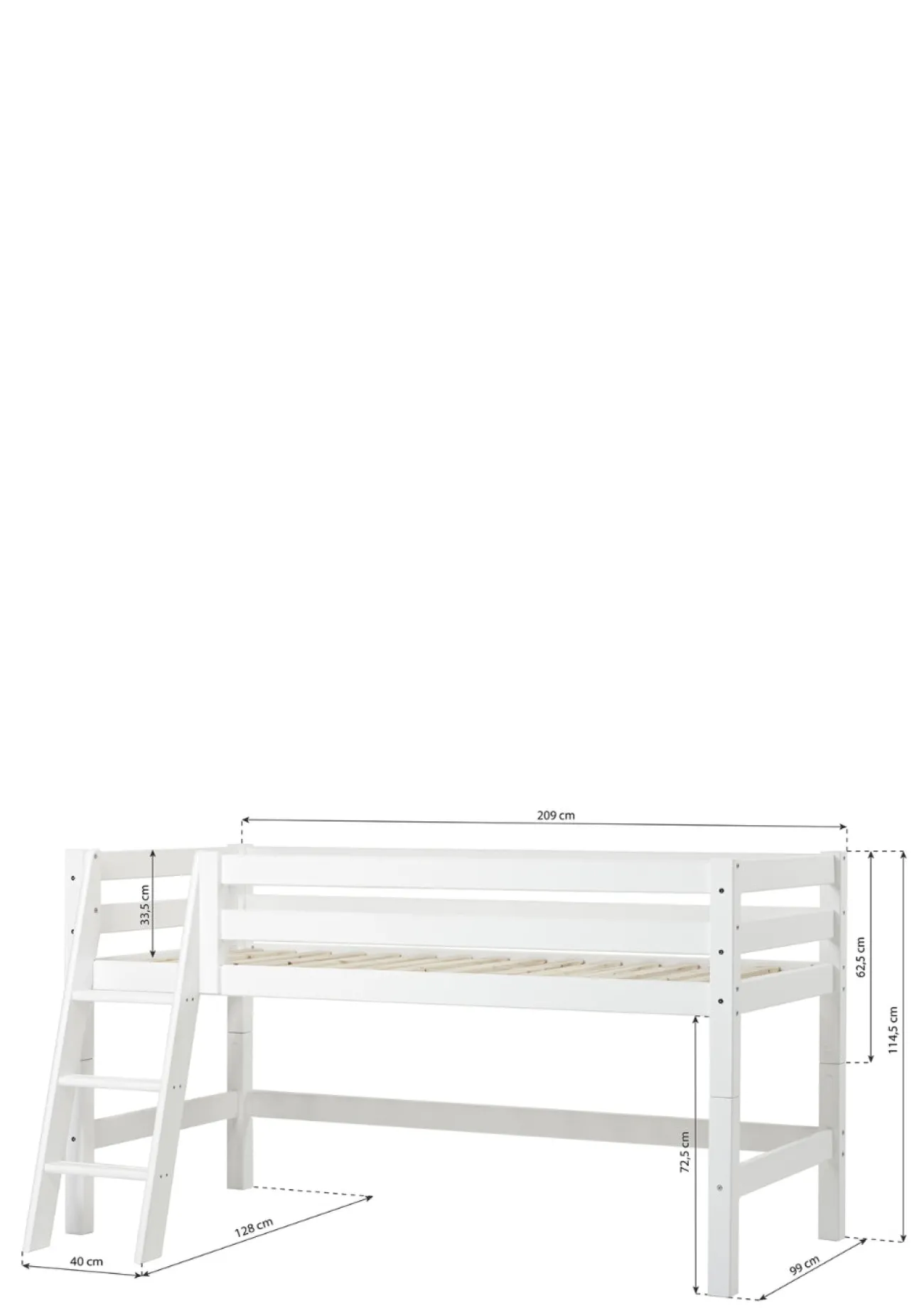 - Bettgröße, schräge Leiter: L 209 x H 114 x T 128 cm