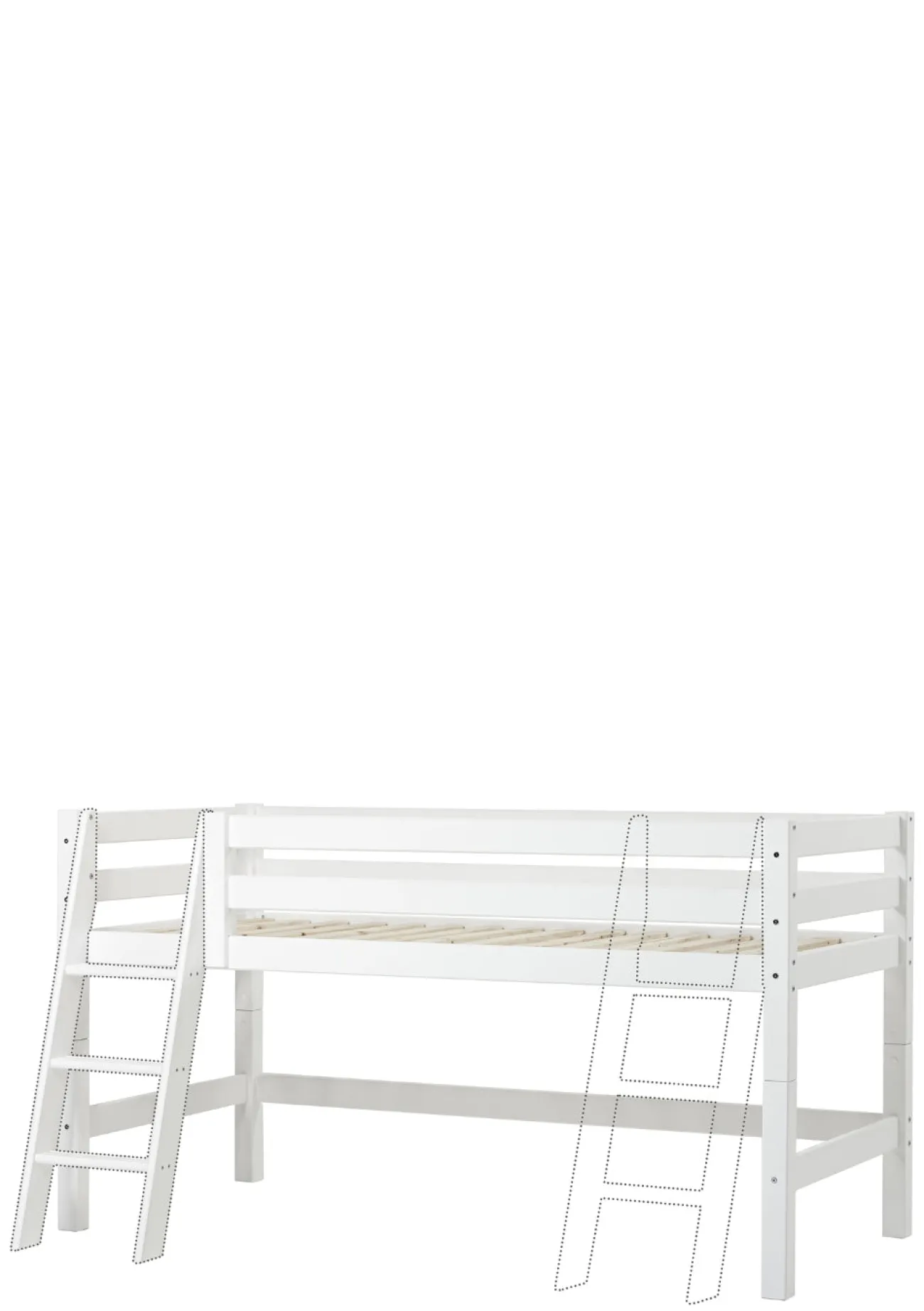 Dieses moderne Halbhochbett ist in verschiedenen Größenvarianten erhältlich und kommt nach Belieben mit einer schrägen oder einen geraden Leiter. Die Höhe des Bettes ist prima für kleinere Kinder geeignet. Denn es nicht so hoch, dass sich diese unsicher fühlen könnten. Den Platz unter dem Bett kannst dafür nutzen, deinem Liebling eine gemütliche Kuschelhöhle zum Verstecken, Spielen oder Vorlesen zu schaffen, oder zu Aufbewahrungszwecken verwenden.