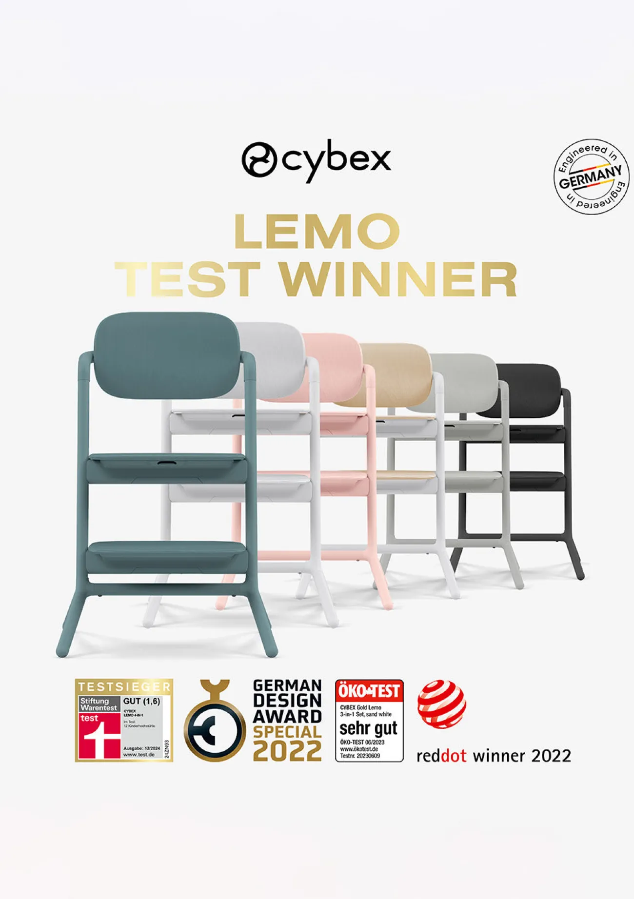 - der Lemo 4-in-1 mit einem beeindruckenden Qualitätsurteil von 1,6 sogar Testsieger im Hochstuhl-Test der Stiftung Warentest 12/2024