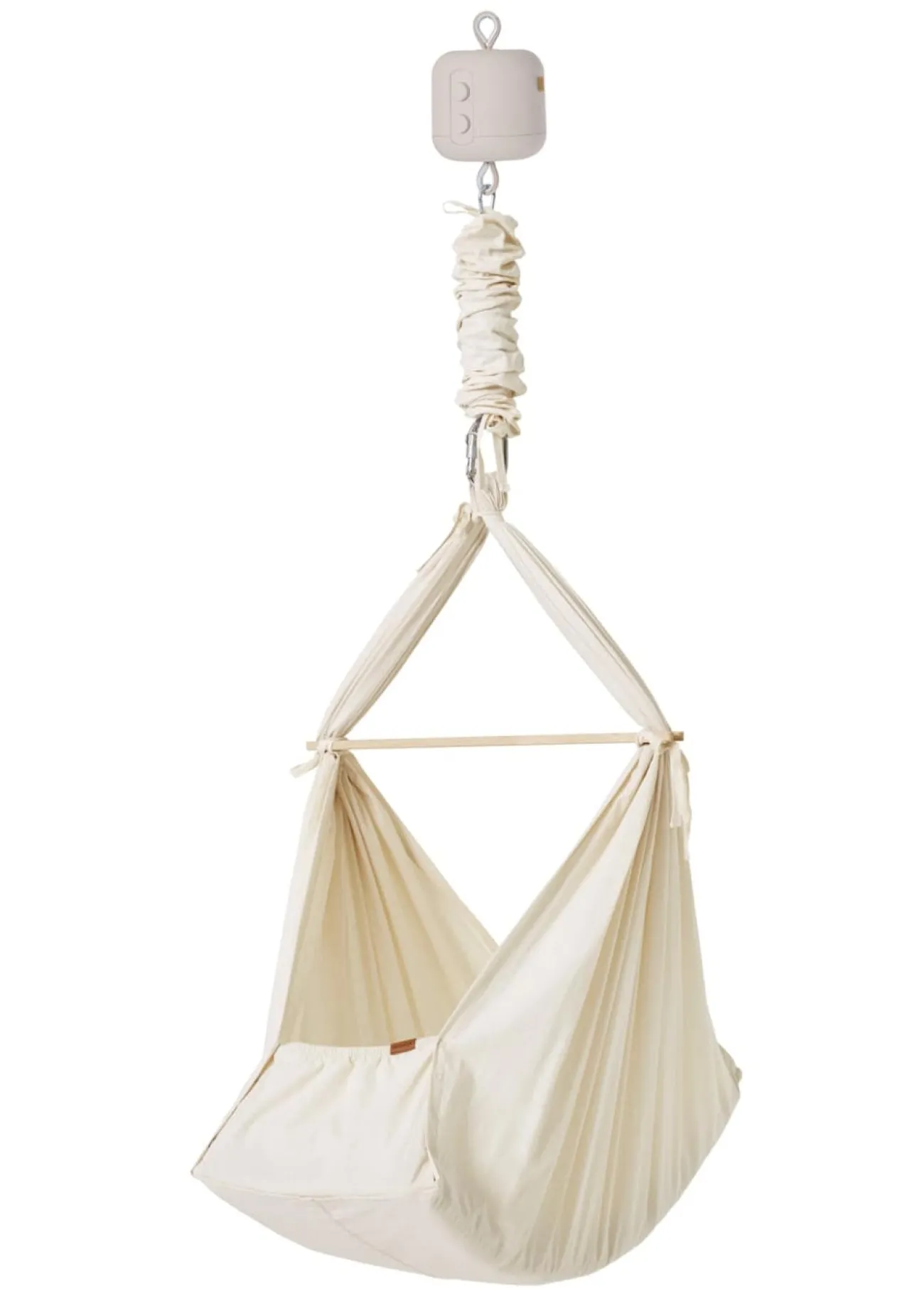 - Federwiege aus ökologischer Baumwolle inkl. Querstange, Feder mit Sicherungsgurt, Stoffbeutel, Matratze mit abnehmbarem Bezug, Spannbettlaken, Karabiner mit Schraubverschluss und Gummiisolierung