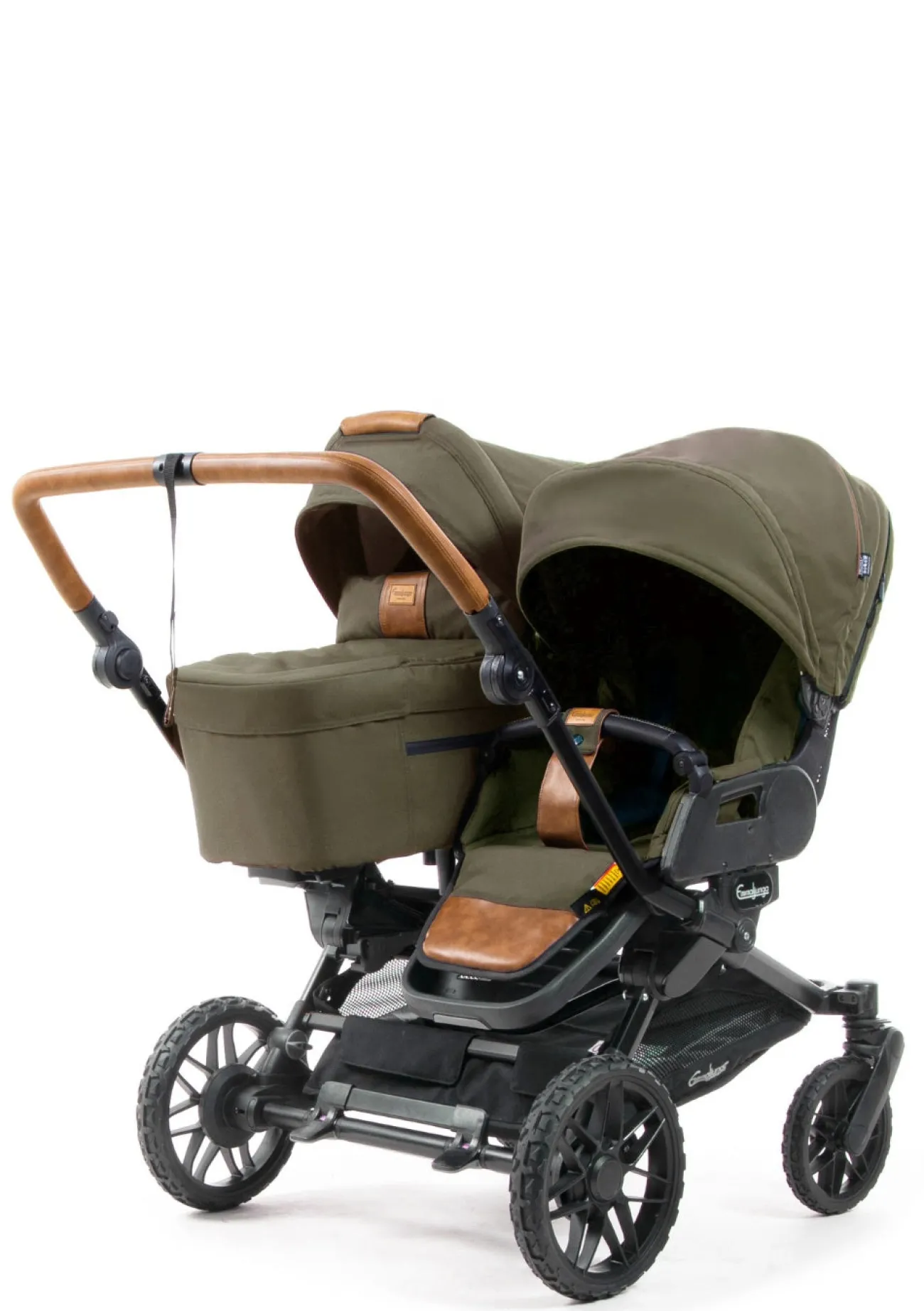 - Doppelkinderwagen im robusten Outdoor-Look – inklusive Babywanne und zwei FLAT+ Sitzen mit vollständig flacher Liegeposition für entspanntes Liegen auch im Gelände