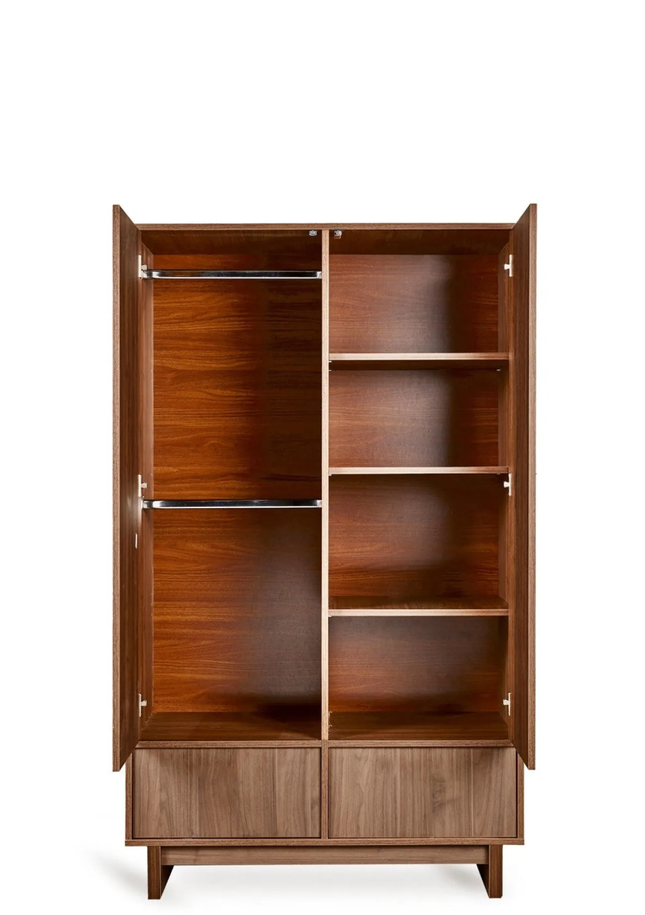 Hinter den beiden Türen verbergen sich drei höhenverstellbare Regalböden und zwei Kleiderstangen, die sich flexibel an den individuellen Bedarf anpassen lassen. Zwei geräumige Schubladen bieten zusätzlichen Platz für Kleidung oder Accessoires. Dank griffloser Fronten mit Push-to-open-System bleibt das Design pur und elegant – eine stilvolle Lösung, die mit der Familie mitwächst.