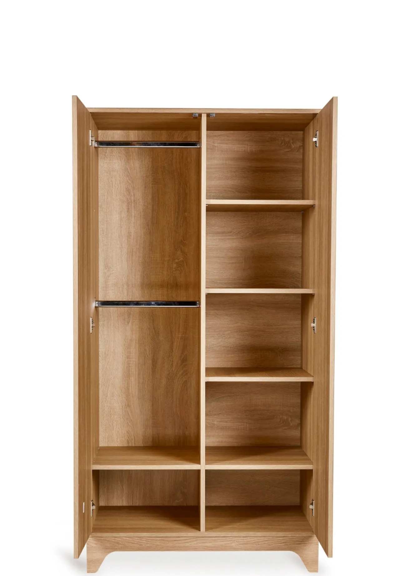 Hinter den beiden Türen verbirgt sich ein durchdacht gestalteter Innenraum mit Einlegeböden und Kleiderstangen, die sich flexibel an unterschiedliche Bedürfnisse anpassen lassen. So entsteht strukturierter Stauraum für Kleidung, Spielsachen oder andere Alltagsdinge. Das grifflos gestaltete Design mit Push-to-open-System sorgt für eine ruhige, klare Optik, die perfekt zum modernen Stil der Tsugi-Serie passt.