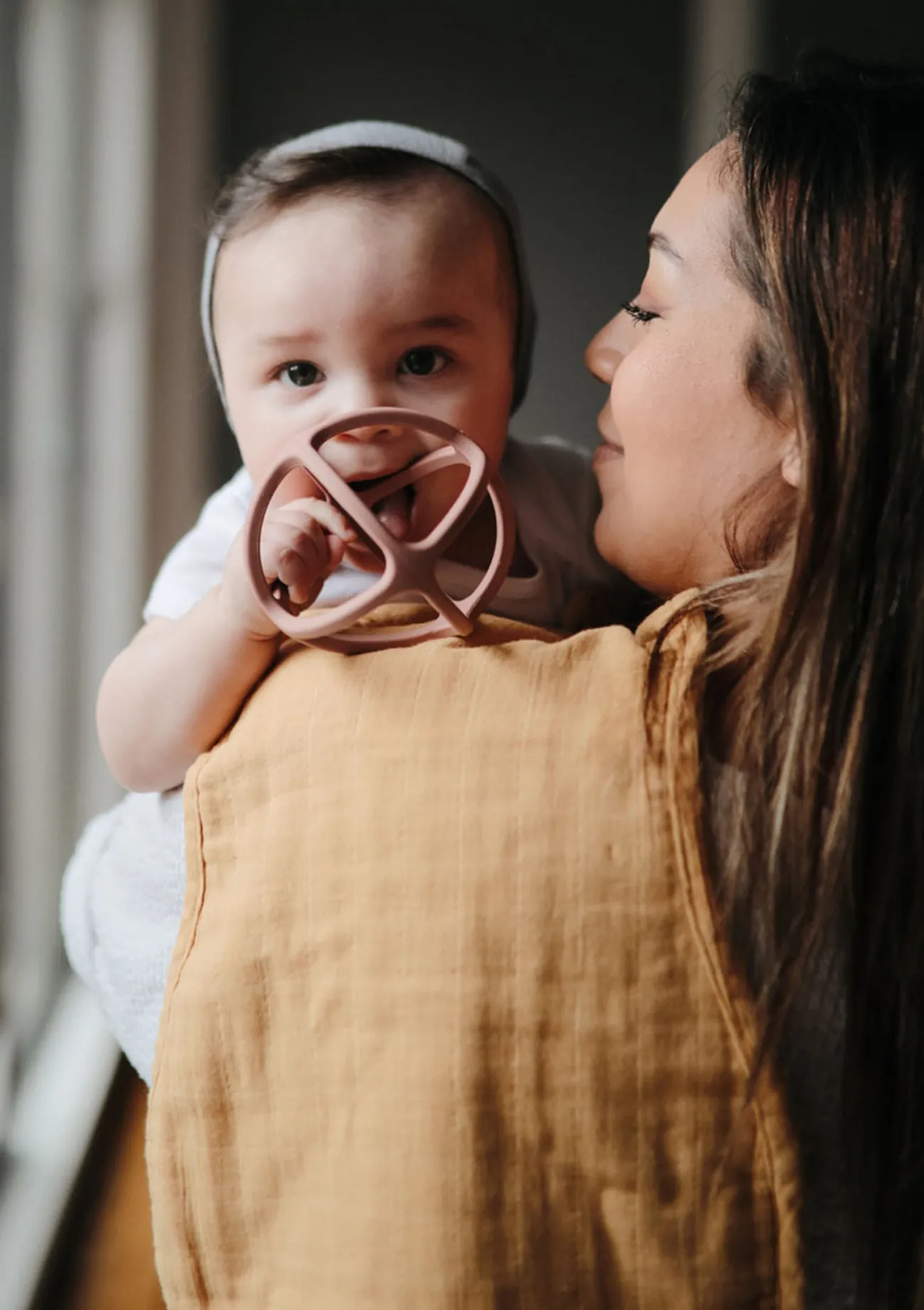 Überprüfen Sie den Beißring vor dem Gebrauch, um sicherzustellen, dass er sauber und unbeschädigt ist. Der Beißring besteht zu 100 % aus ungiftigem, lebensmittelechtem Silikon und ist absolut sicher zum Kauen. Das empfohlene Alter beträgt 3+ Monate.