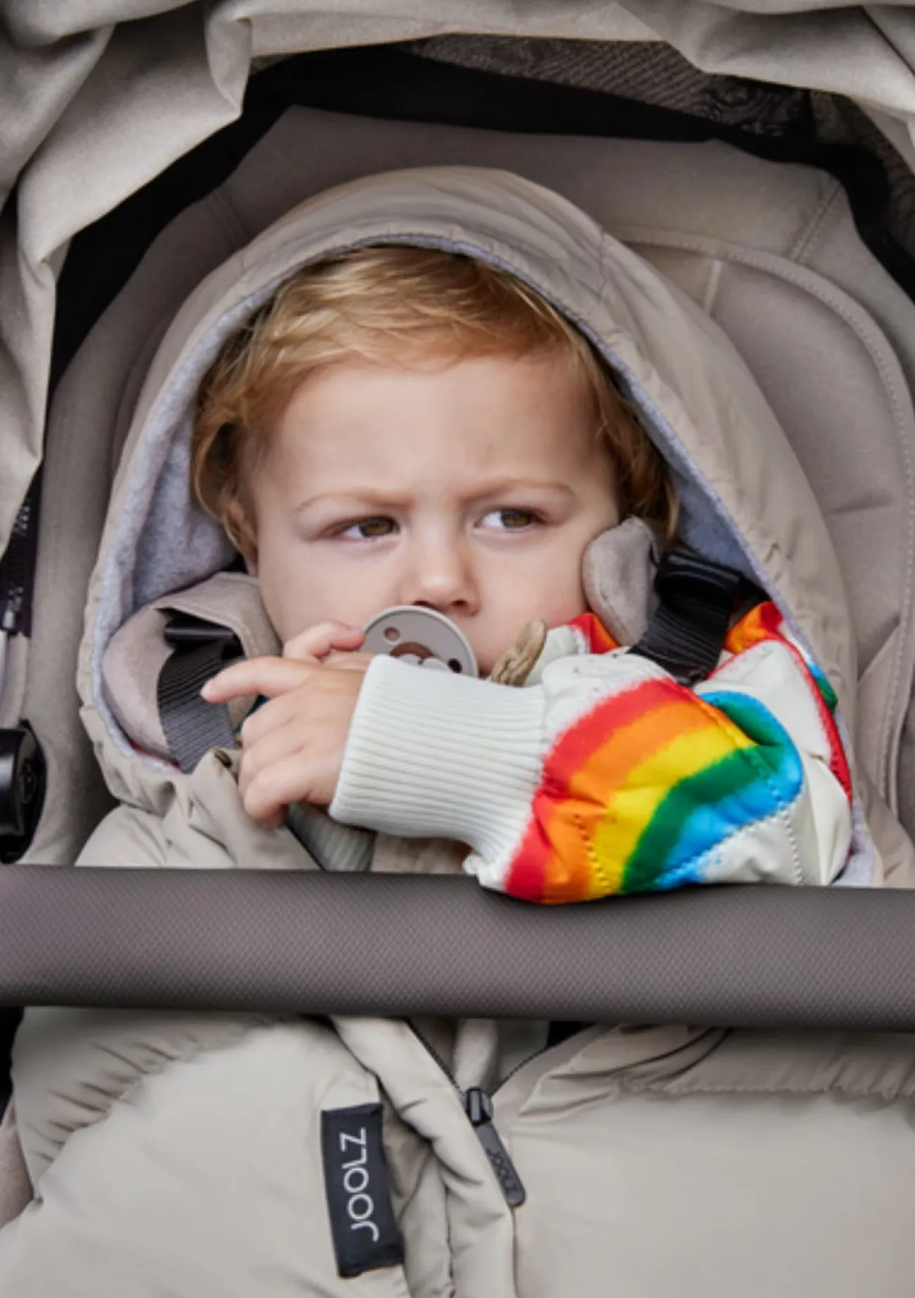 Hält Kälte draußen und Wärme drinnen: der neue Puffer Fußsack von JOOLZ – für mollig warme Winterspaziergänge!
