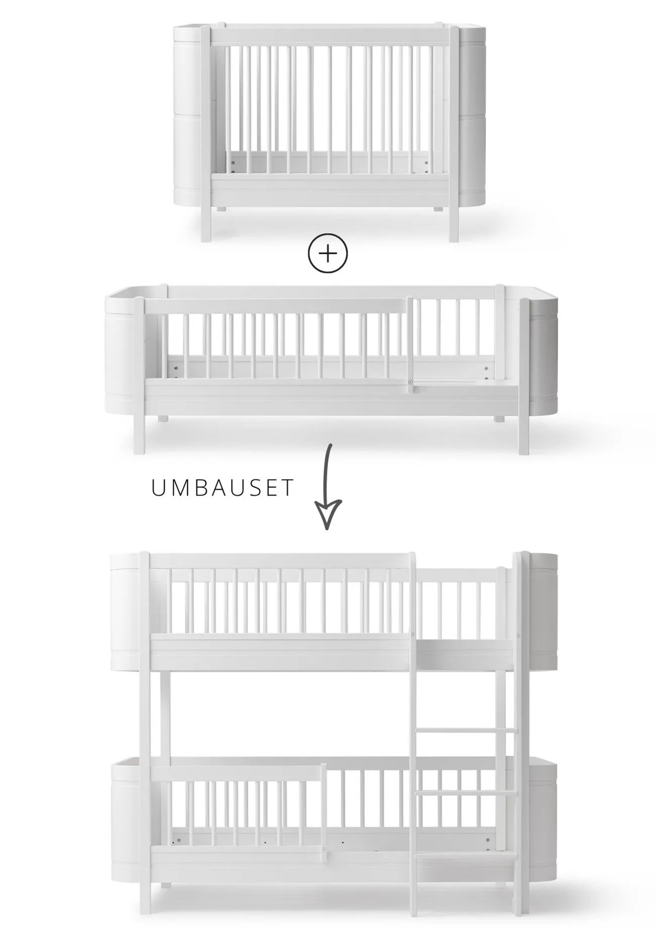 Ihr habt bereits das Babybett und das Juniorbett aus der Mini+ Serie und eure Kinder träumen jetzt von einem Hochbett? Wie schön, wenn sich Möbel den sich ändernden Bedürfnissen anpassen. Mit diesem praktischen Umbauset entsteht aus den vorhandenen Betten im Handumdrehen der Evergreen im Geschwisterzimmer: das Etagenbett.