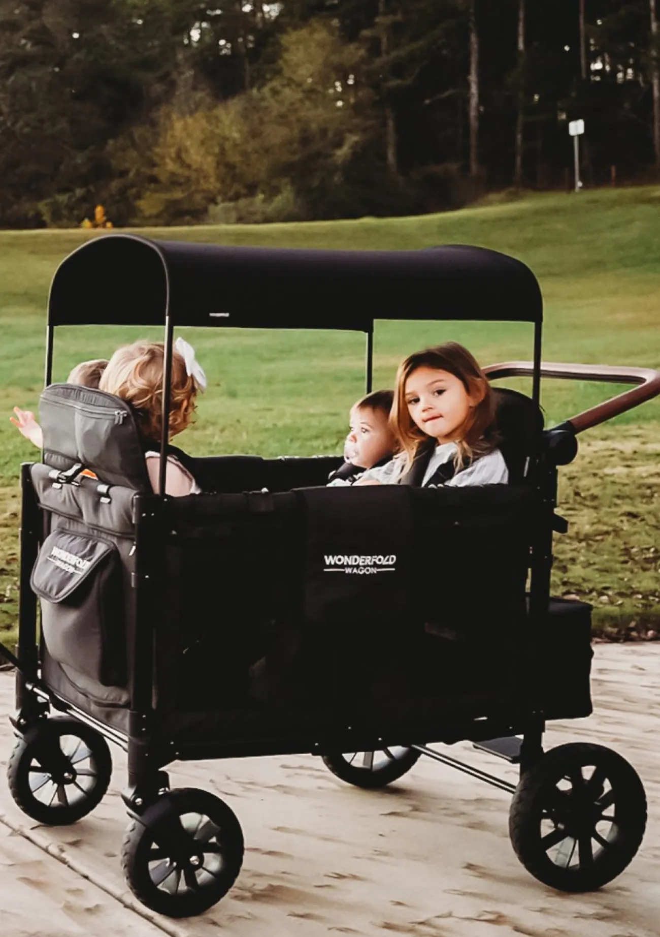 Ultimativen Fahrkomfort – für dich und deine Kids – verspricht der WonderFold W4 Luxe Kinderwagen, das Luxusgefährt unter den KinderVans von WonderFold. Das Modell ist mit vier bequemen, erhöhten Sitzen ausgestattet, deren Rückenlehnen sich fürs Mittagsschläfchen unterwegs neigen lassen, einzelne Sitze können für mehr Platz im Inneren herausgenommen werden, wenn du mit weniger Kindern unterwegs bist. Sicher angeschnallt werden die Kleinen mit dem magnetischen 5-Punkt-Sicherheitsgurt, der sich super einfach bedienen lässt und nicht ungemütlich ist. Das großzügige Verdeck bietet deinen Kinder einen optimalen Sonnenschutz und macht das Modell zum mobilen Schattenspender im Sommer. Der benutzerfreundliche Klappmechanismus ermöglicht den unkomplizierten Transport im Kofferraum. Langlebige und wetterfeste Materialien machen den KinderVan zu einem langjährigen Familienbegleiter. Ob belebte Straßen in der Stadt, ruhige Naturpfade oder die Strandpromenade – mit seinen geländegängigen XL-Räder ist dieser komfortabel ausgestattete Bollerwagen für jedes Abenteuer gewappnet. Eine Bereicherung für anspruchsvolle Familien auf der Suche nach besonderen Momenten!