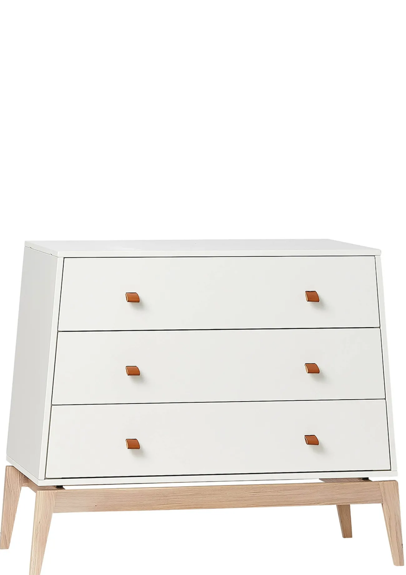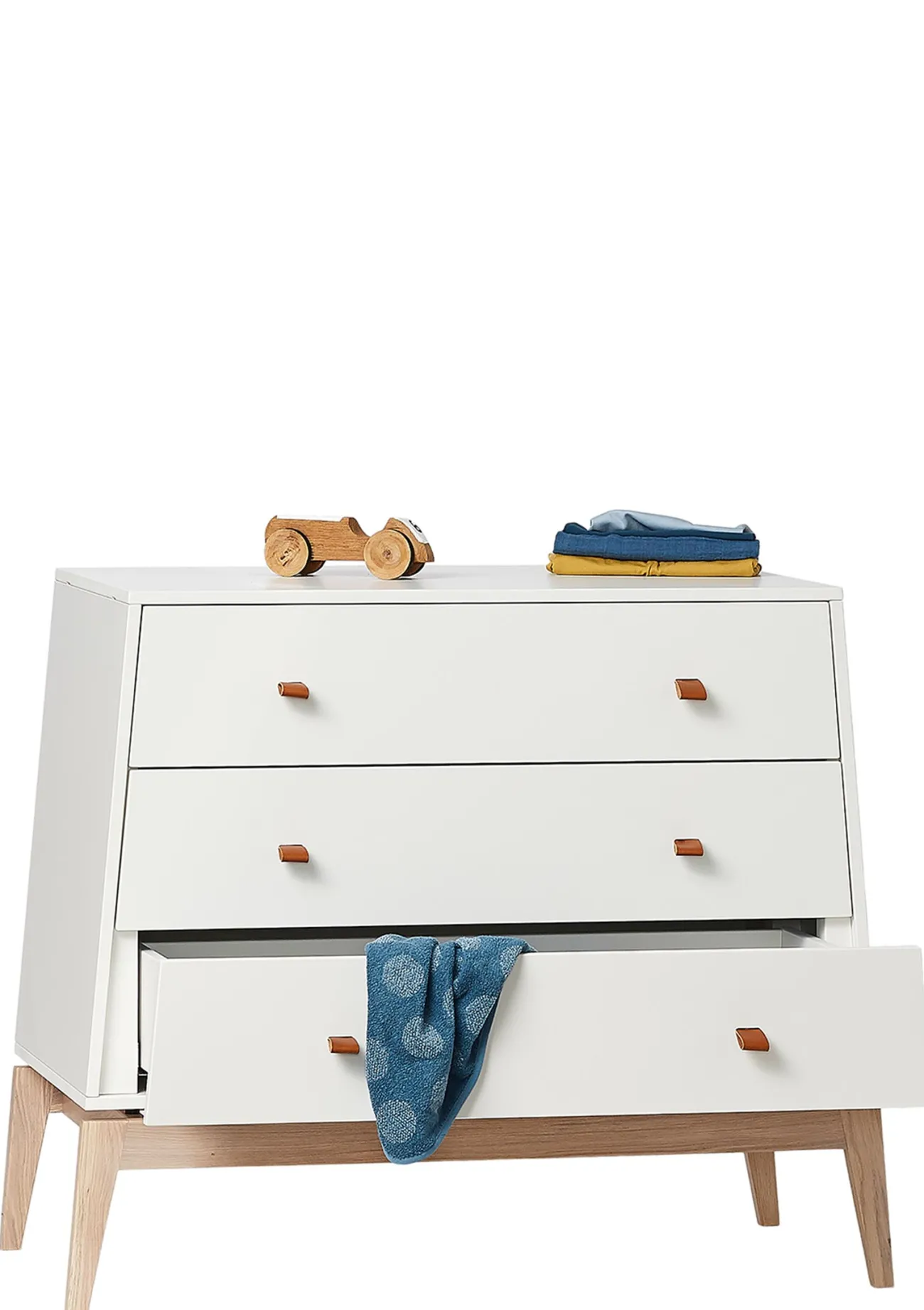Drei geräumige Schubladen mit Soft-Close-Funktion bieten ausreichend Platz für Kleidung, Spielsachen und andere Utensilien. Dank der weichen Ledergriffe in kindgerechter Höhe können selbst die Kleinsten die Schubladen leicht öffnen und schließen – perfekt, um die Selbstständigkeit zu fördern. Die durchdachte Höhe macht die Kommode außerdem ideal, um sie mit dem optional erhältlichen Wickelaufsatz zu kombinieren und als Wickelplatz zu nutzen.